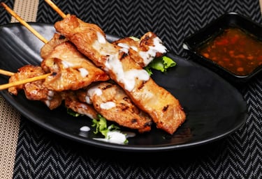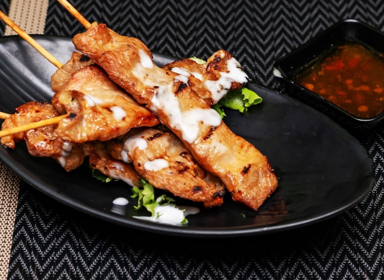 Juicy moo ping skewers grilled to perfection, bursting with smoky flavor.